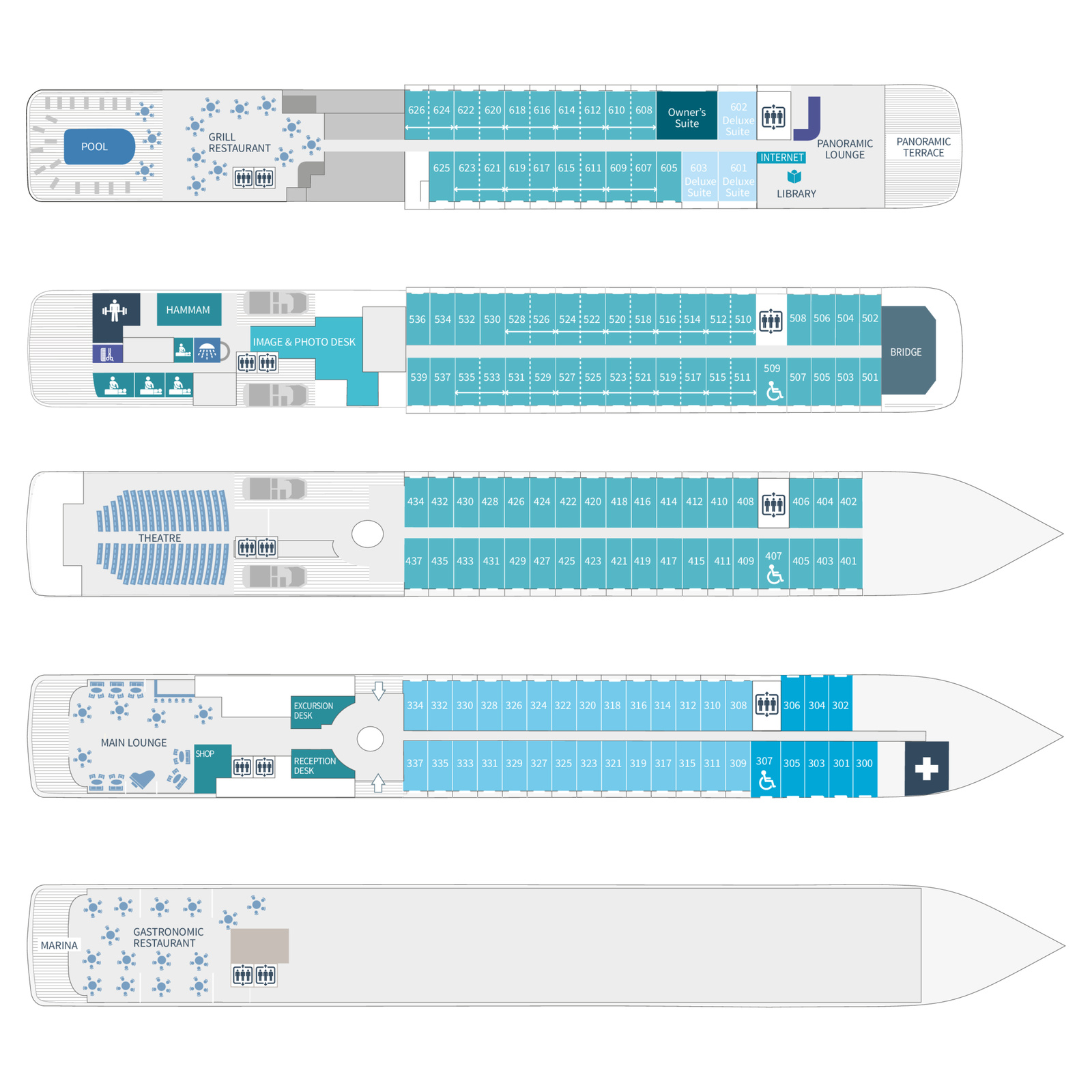 • Panorama-Lounge auf Deck 6: Bibliothek, Internetraum, Bar, Live-Unterhaltung an manchen Abenden